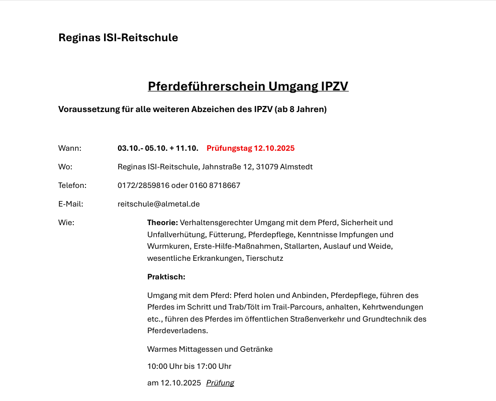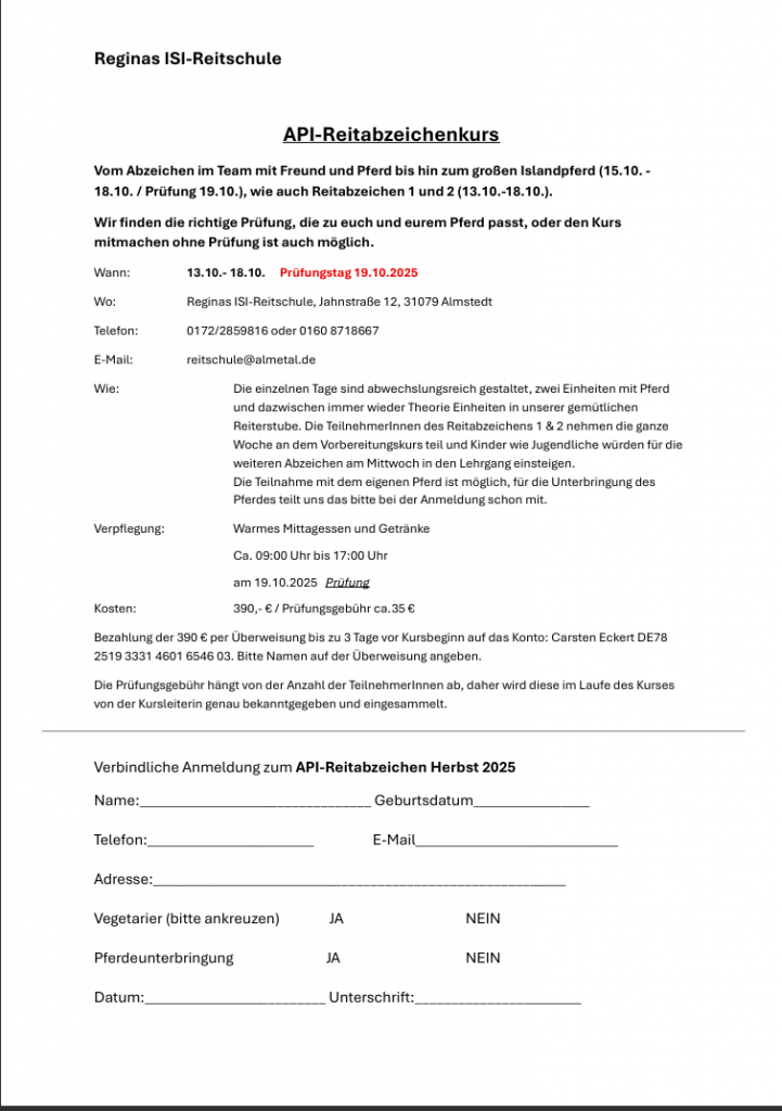 Wenn ihr Interesse habt an einem der Kurse teilzunehmen, oder bei weiteren Fragen, dann meldet euch gerne unter  0160 8718667 oder reitschule@almetal.de
