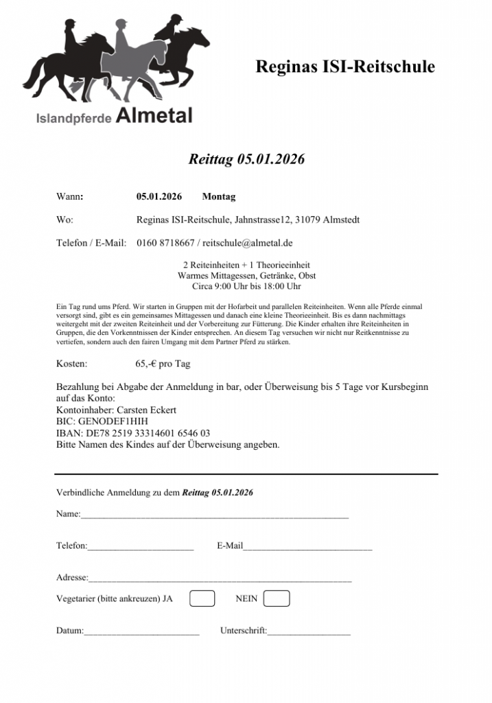 Die Reitschule bietet am Montag den 05.01.2026 einen Tag auf dem Islandpferdehof an. Die Kinder können einen Tag (09:00 bis ca. 18:00) bei uns auf dem Hof verbringen.